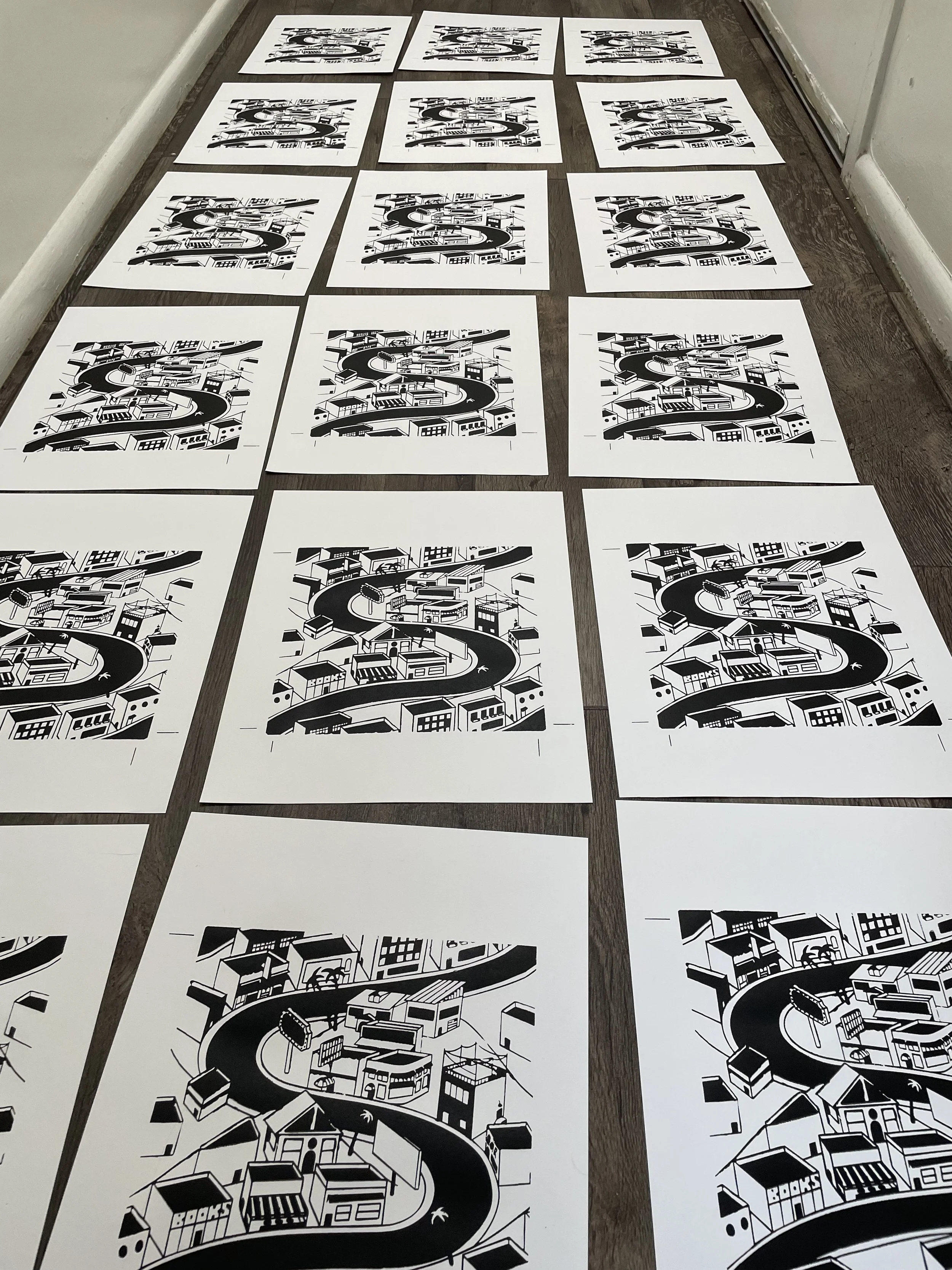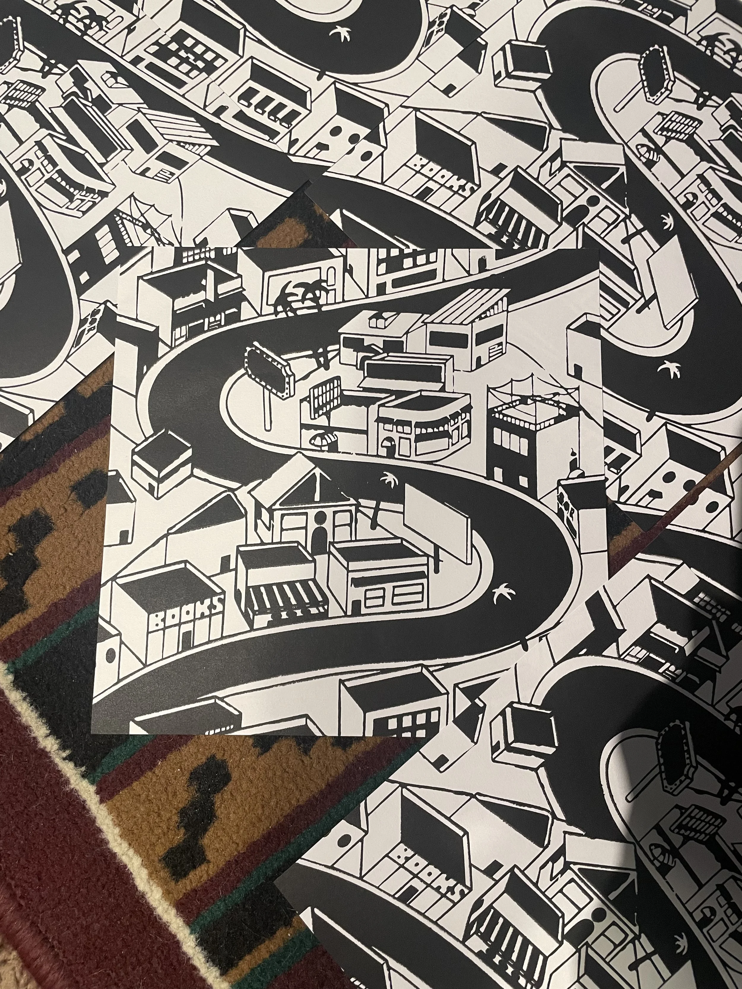 For this project, the client needed a repeatable pattern based on Sunsent Boulevard in Los Angeles, California. A place I spent a couple of years living in and I hold very near and dear to my heart. I ended up screen printing individual tiles of the design for a large wall display.
